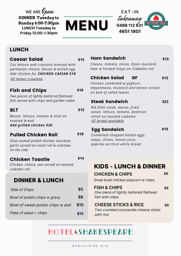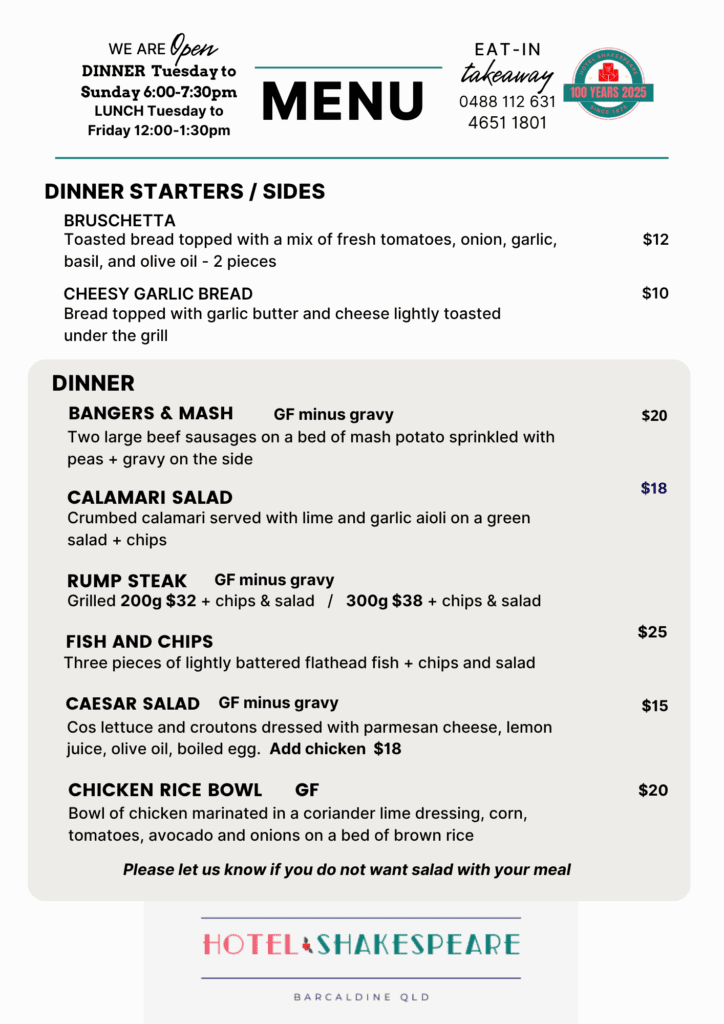 PLEASE NOTE – SUNDAY DINNER IS PIZZA ONLY – EAT-IN OR TAKEAWAY
